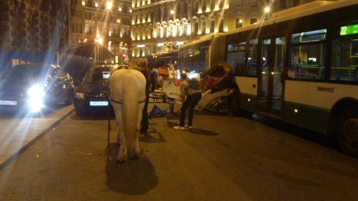 Поздно вечером 22 августа около 23:00 на Малой Морской улице в Центральном районе Санкт-Петербурга пассажирский автобус столкнулся с каретой.