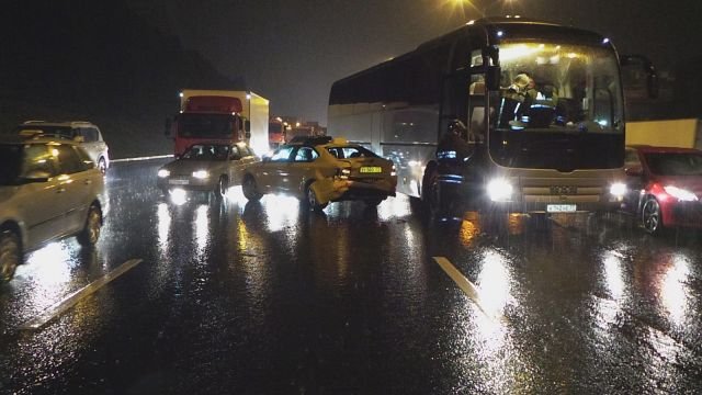 Столкнулись автобус и пять легковых автомобилей. По предварительной версии, один из автомобилей ударился в заграждение и влетел в отбойник, после чего другая машина развернулась на мокрой дороге, отчего ее выбросило на встречную полосу.