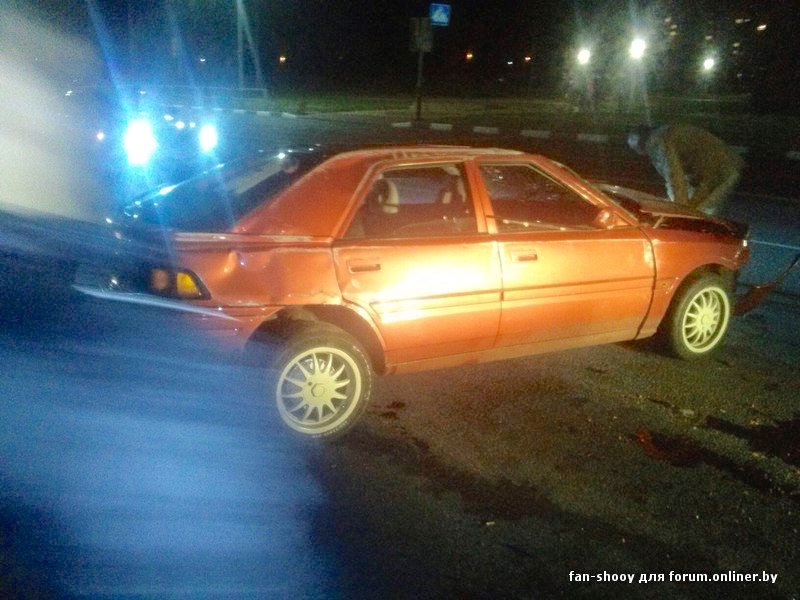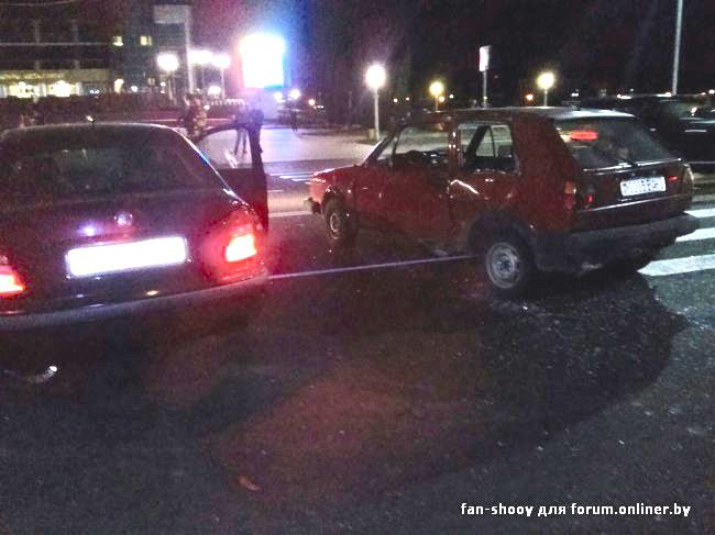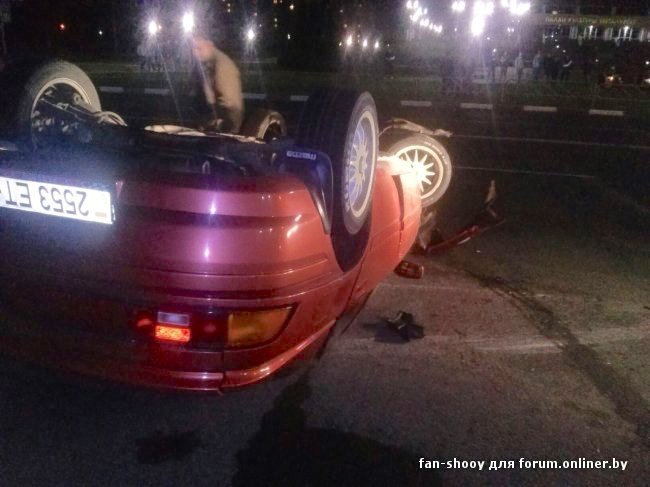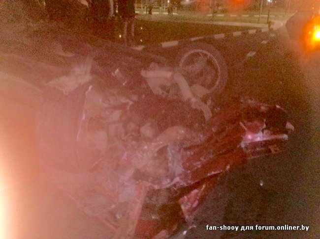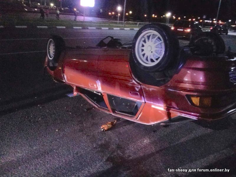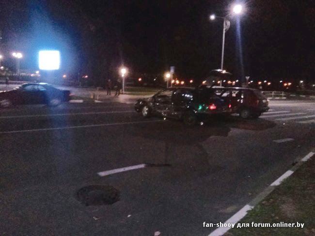На мазде не сбрасывая скорость влетел на пешеходный и увидев пешехода крутанул руля в лево. В заносе врезался в шкоду сам перевернулся и зацепил миневэна. Шкоду от удара отбросило на гольфа. Пешеход вовремя успела отскочить. Виновник сразу после ДТП бегал по пострадавшим машинам, волновался или все живы". Источник: onliner.by