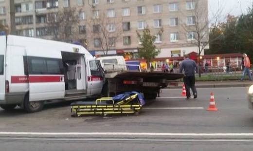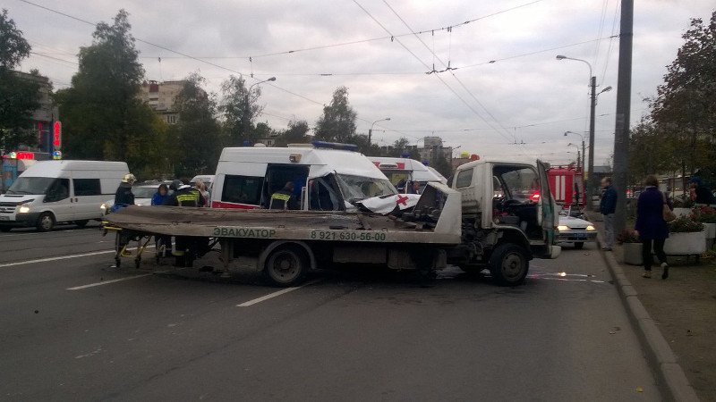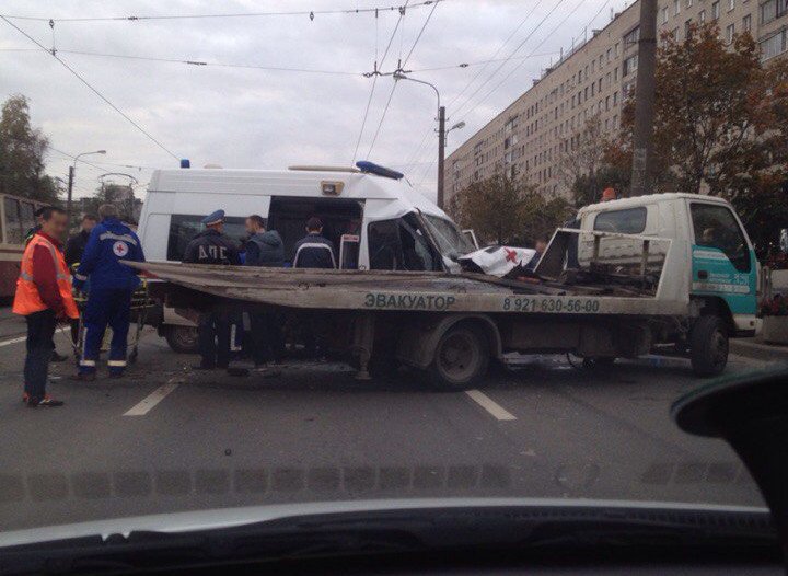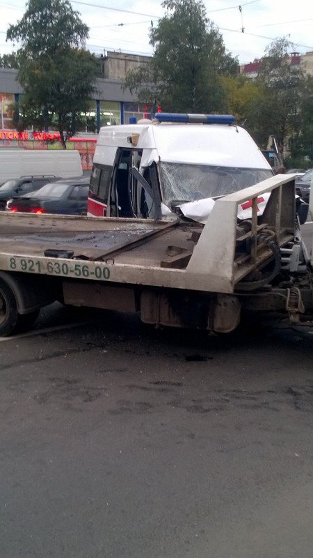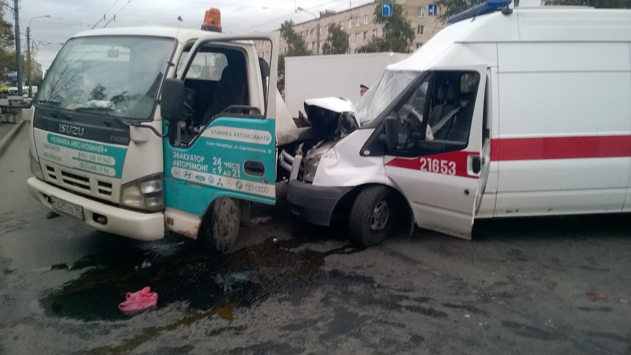 30 сентября в Санкт-Петербурге в 17:10 у дома 16 на улице Народной произошло столкновение кареты "скорой помощи" и эвакуатора Isuzu.