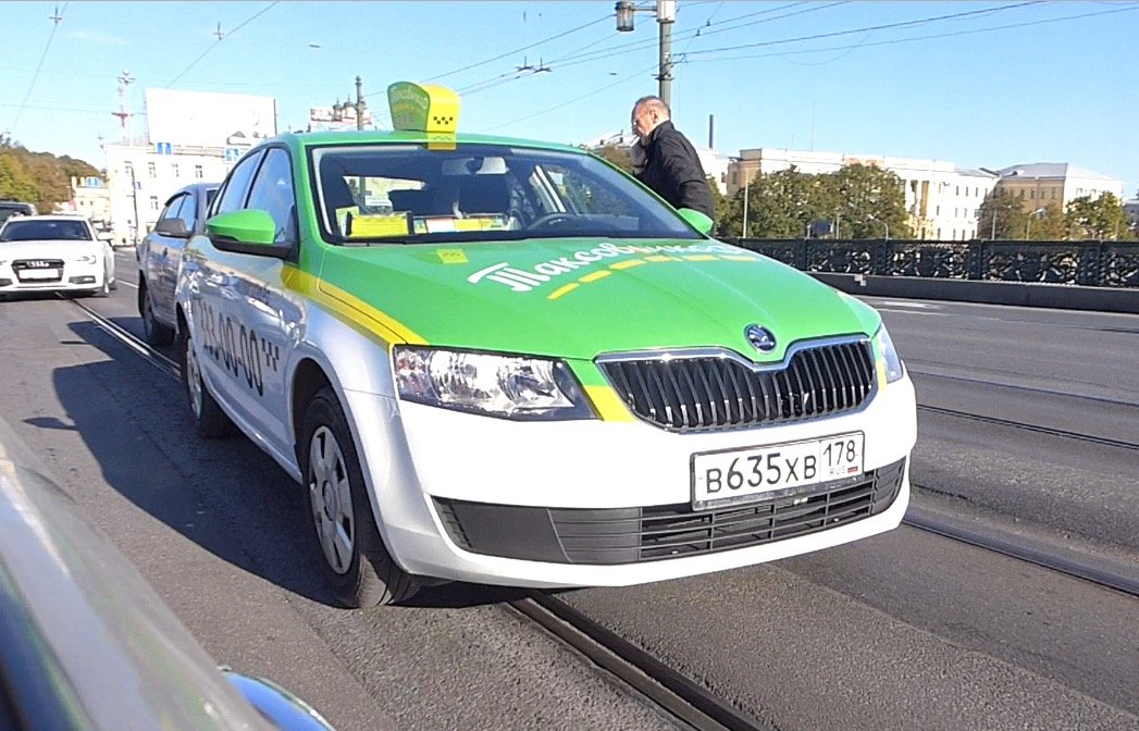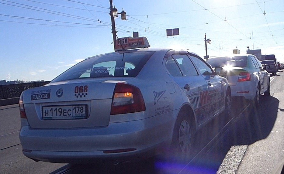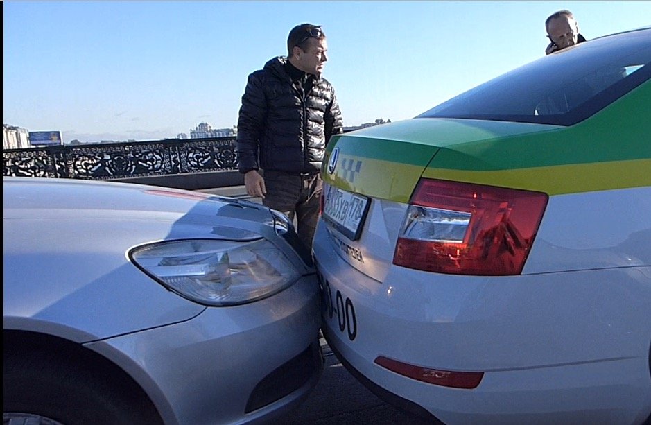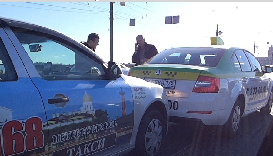 Торопливые таксисты спеша к клиентам (или с клиентами к месту назначения) не выдержали безопасной дистанции между своими автомобилями и столкнулись на трамвайных рельсах на Литейном мосту.