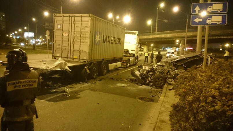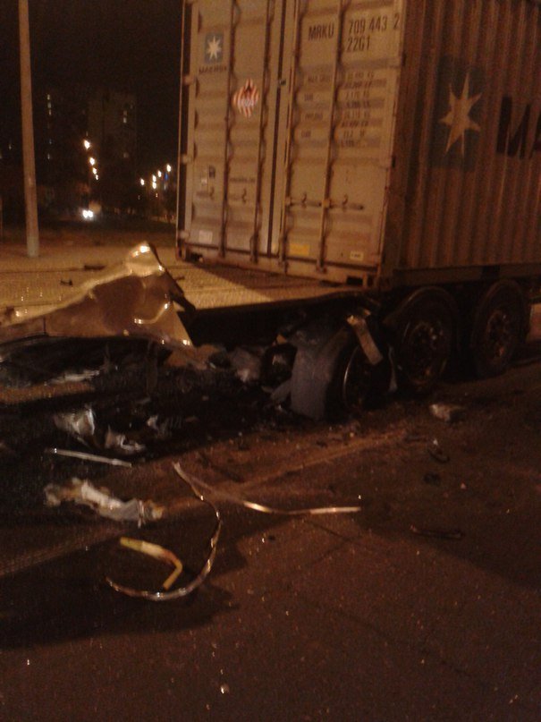 «Фура четко стоит на полосе. Даже по сплошным это видно. Audi разогналась до скорости 150-190, не меньше. В самом конце, заметив фуру, начала уходить. Но не смог. На скорости от 70 и до 120 так не срезает. Резкий поворот направо и угол наклона. Вот итог».