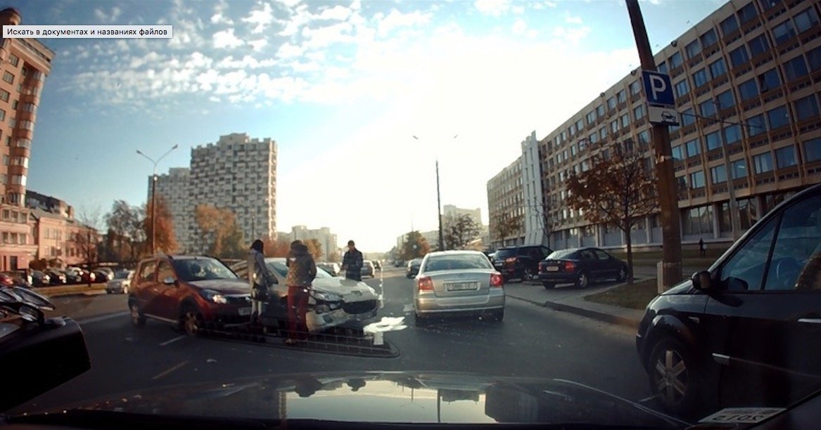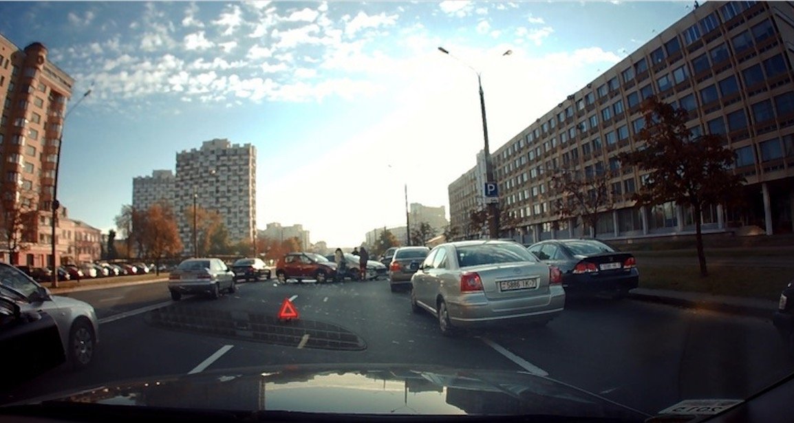 Непонятное маневрирование (возможно неожиданный разворот?) стали причиной столкновения двух легковых автомобилей Renault и Peugeot на проспекте Машеврова в столице Белоруссии.