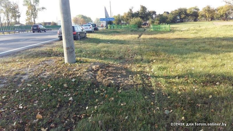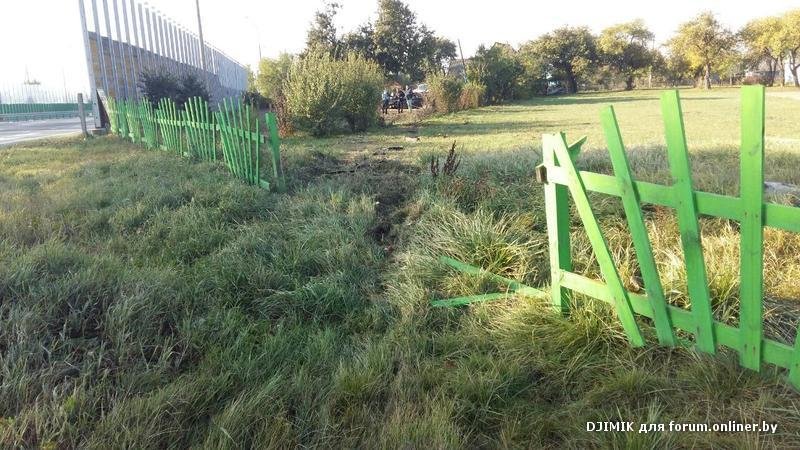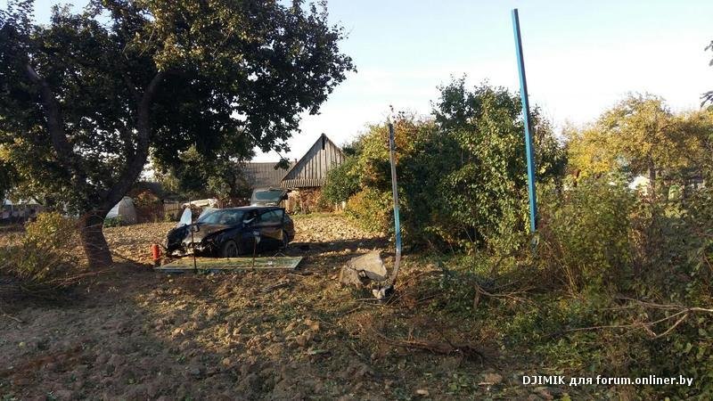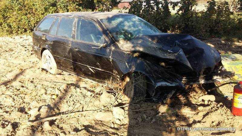 Авария в Белоруссии - в пятницу 16 октября около половины десятого утра на Брестской автодороге на 19 км в д. Василевщина около кафе Дедова Карчма автомобиль BMW E39 на скорости около 150 км в час потерял управление и съехал с трассы, после чего проломил ограждение частного огорода и сбил рекламный щит шиномонтажного частного сервиса.