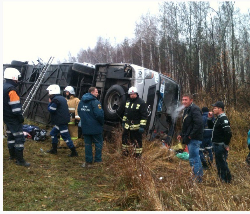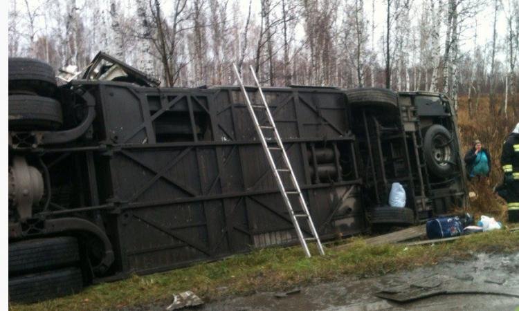 Водитель автобуса Hyundai, двигаясь из Кургана в сторону Челябинска, выехал на полосу встречного движения, где столкнулся с большегрузным автомобилем Renault Premium. От удара автобус съехал в кювет и опрокинулся.