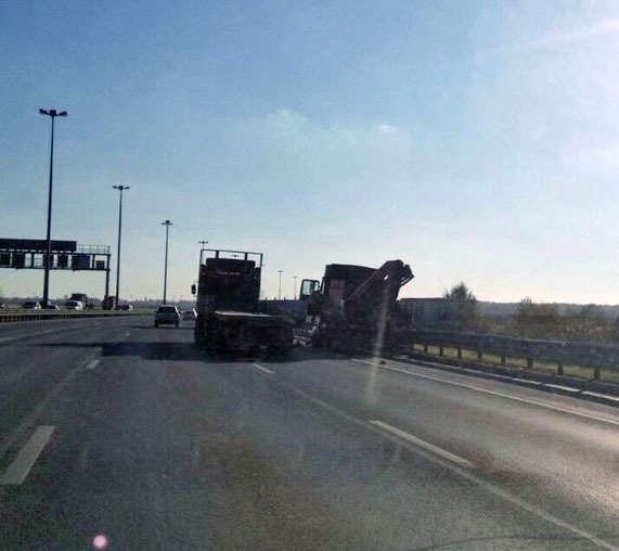 На КАД сегодня произошла двойная авария со смертельным исходом. Водители столкнувшихся автомобилей обсуждали происшествие, сидя в машине одного из участников ДТП, но в этот момент в автомобиль въехал грузовой манипулятор MAN.