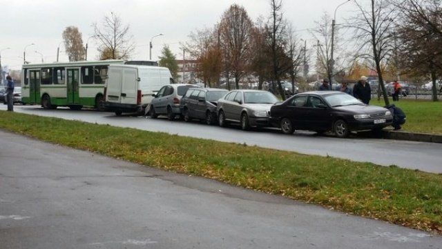 В Колпино неуправляемый рейсовый автобус раздавил сразу несколько легковушек.