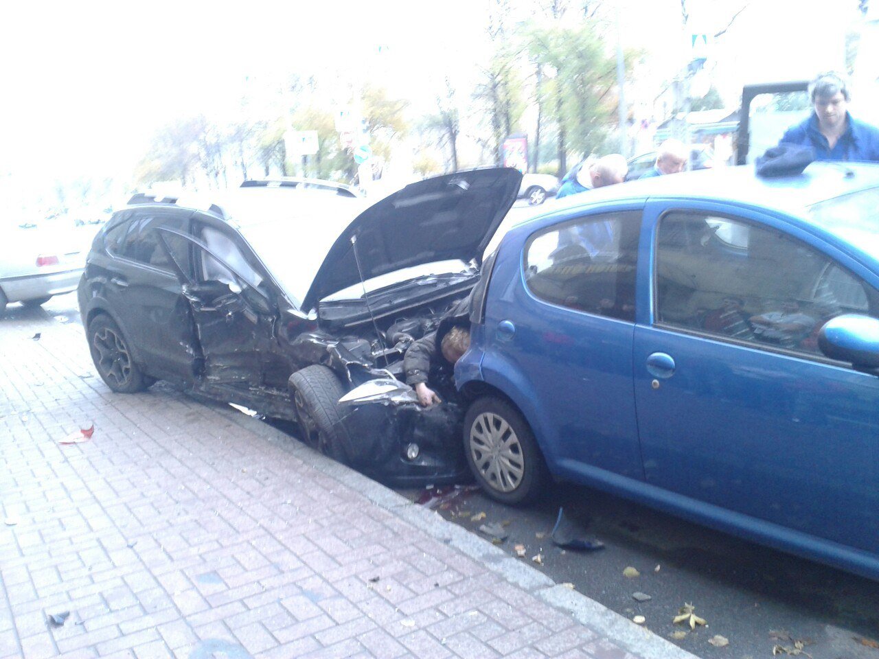 На перекрестке столкнулись BMW и черный "паркетник". Второй автомобиль отлетел в стоящий Peugeot, возле которой находился человек.