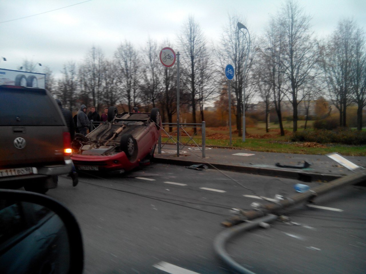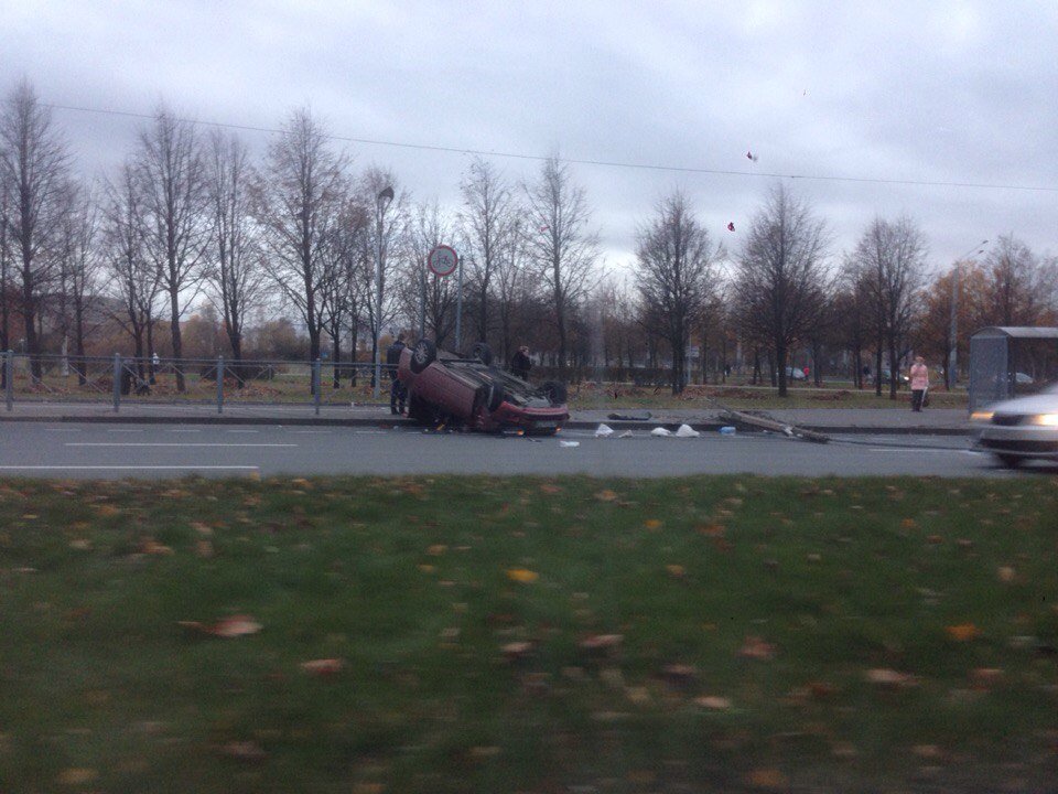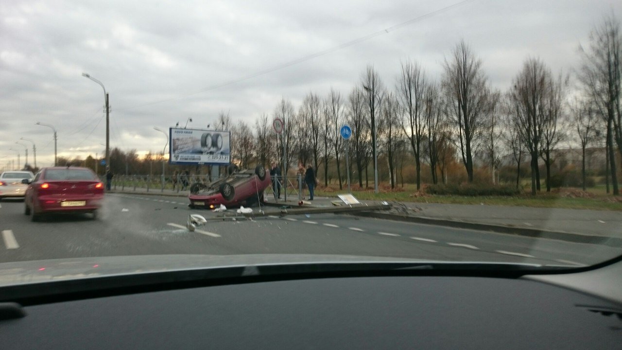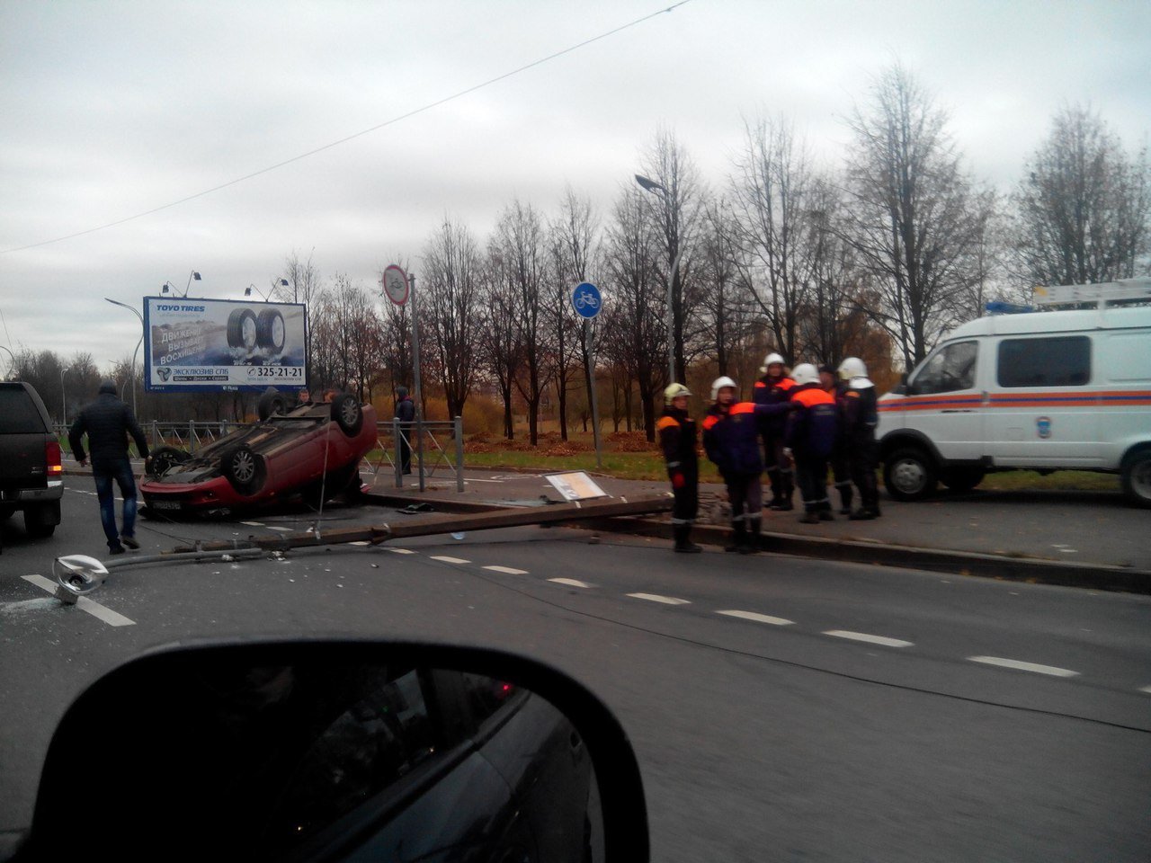 Утром в четверг, 29 октября, на проспекте Луначарского, 94 в Санкт-Петербурге автомобиль Lada Granta снес бетонный столб и перевернулся.