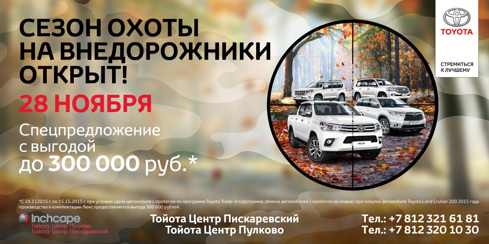 «Сезон охоты на внедорожники» состоится 28 ноября 2015 года в автоцентрах Тойота Центр Пулково по адресу: СПб, Шереметьевская, 17А; Тойота Центр Пискаревский по адресу: СПб, Руставели, 31А.