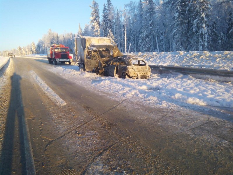 По предварительной информации, водитель автомобиля «ГАЗель» 1975 года рождения при совершении обгона не убедился в безопасности маневра и врезался в автомобиль Opel Corsa под управлением водителя 1959 года рождения. После столкновения автомобили загорелись.