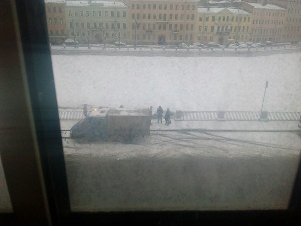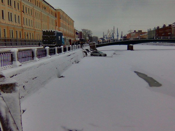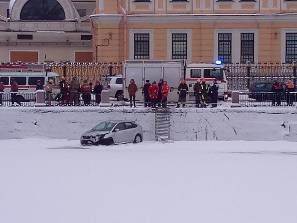 Инцидент произошел утром в понедельник, 15 февраля. В Санкт-Петербурге в Фонтанку упал автомобиль, однако лед выдержал машину.