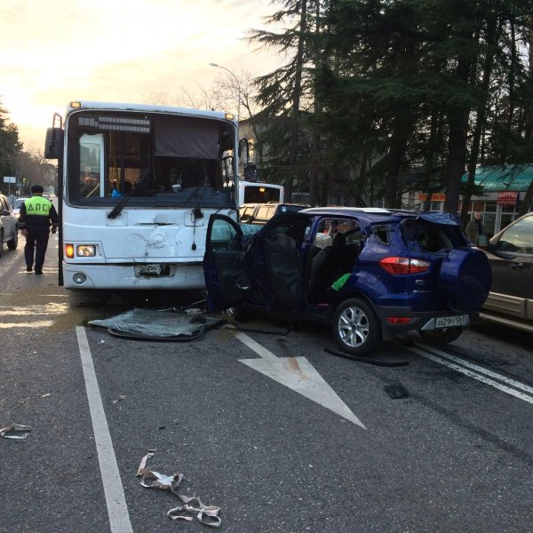Крупная авария произошла в городе Сочи на улице Лазарева. При столкновении легкового автомобиля и рейсового автобуса погибли два человека и еще трое пострадали.