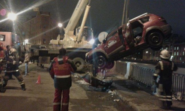 Автомобиль пробил ограждение и упал в реку с Мало-Калинкиного моста. Внутри находилось два человека. Они покинули автомобиль самостоятельно и ждали, пока спасатели поднимут их наверх с помощью лестницы.