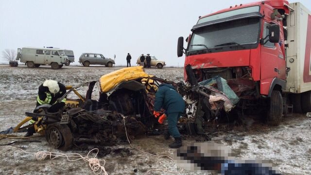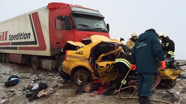 Трагедия произошла утром в субботу, 20 февраля, в 04.30 мск на 95-м километре автодороги "Волгоград-Элиста" в Малодербетовском районе Калмыкии. Большегруз смял машину такси – четыре человека погибли.
