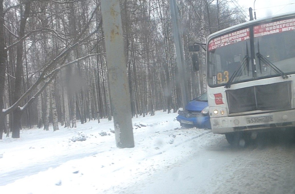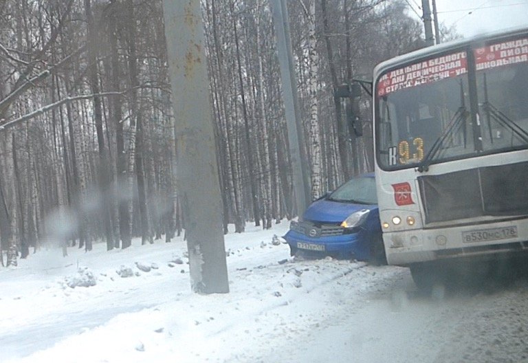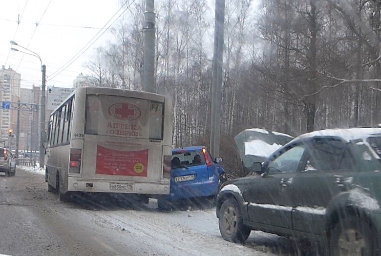 Авария на проспекте Испытателей с участием маршрутного автобуса и легкового хэтчбэка Nissan Note случилась в субботу 20 февраля около 10-30 утра. Судя по всему водитель Ниссана потерял управление автомобилем и машину занесло перед ехавшим здесь-же микроавтобусом-маршруткой.