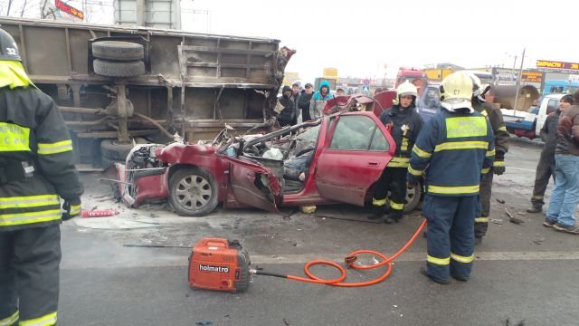 По предварительной информации, водитель автомобиля Peugeot 406 при обгоне по обочине врезался в припаркованный грузовик Isuzu, который от удара опрокинулся на бок.