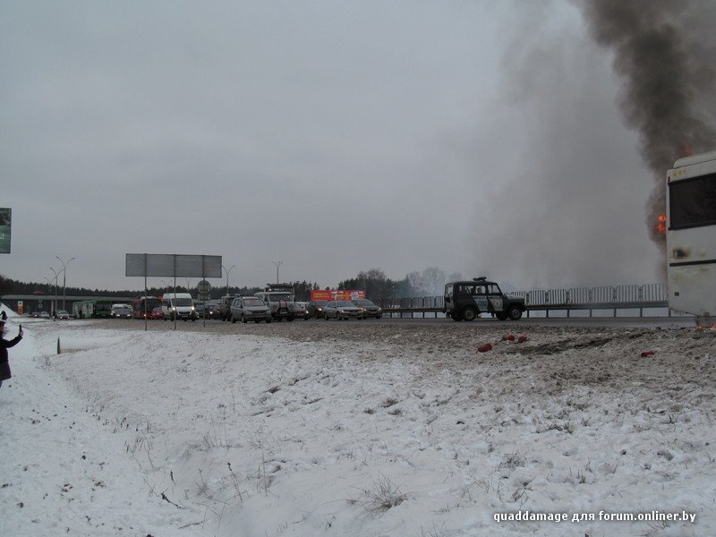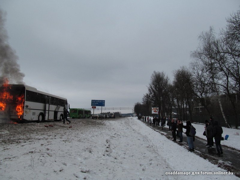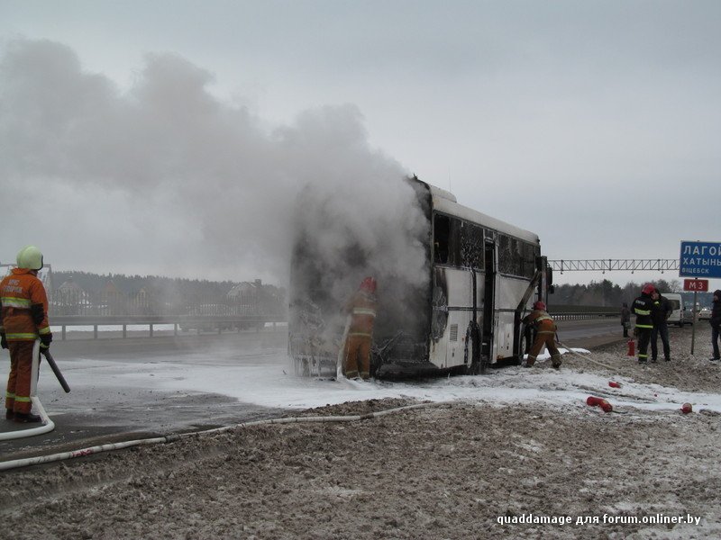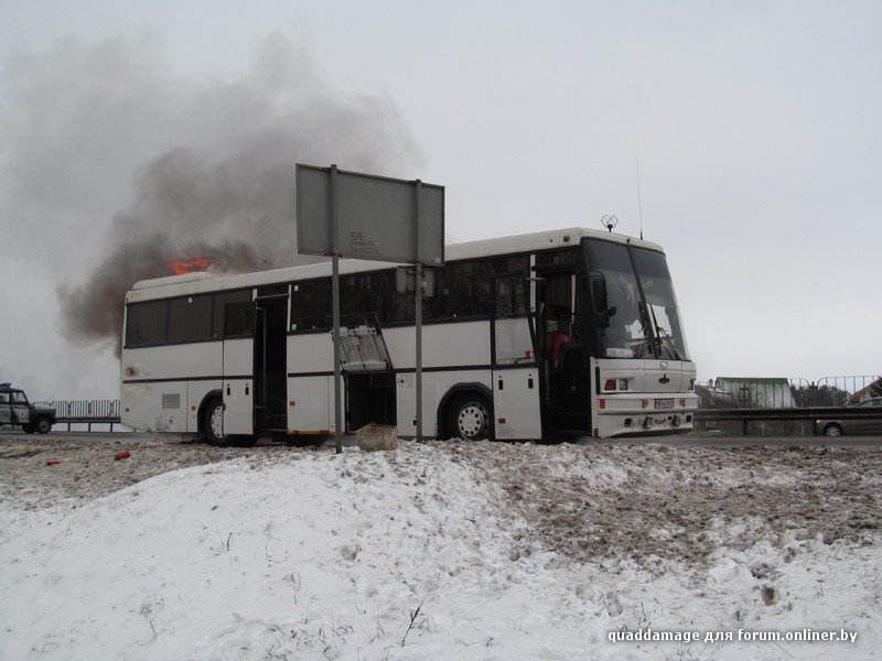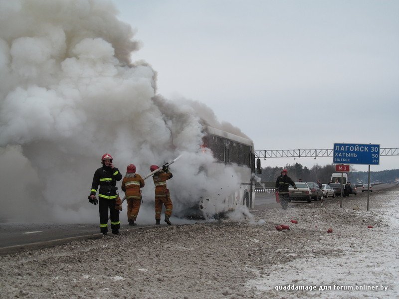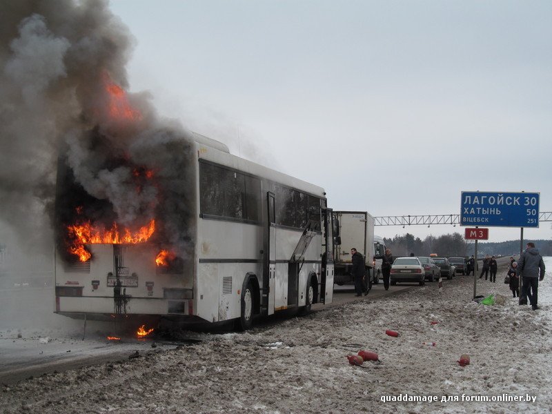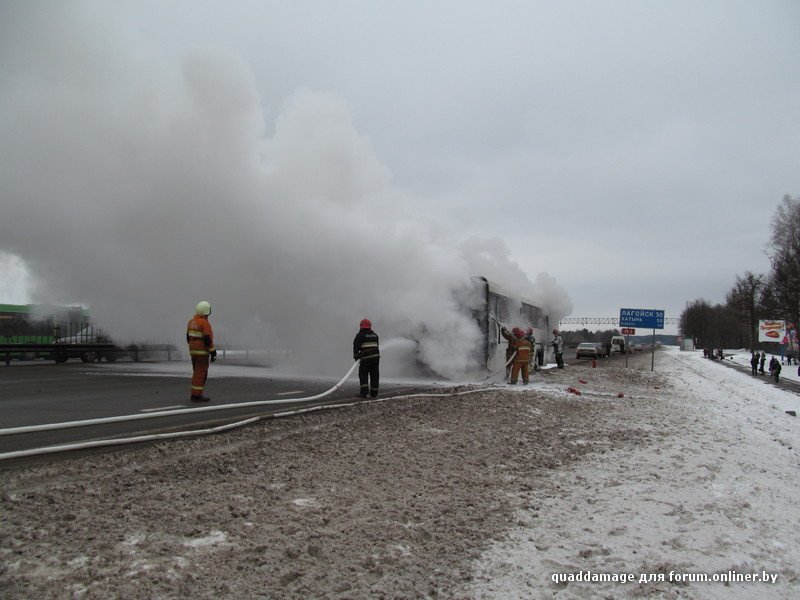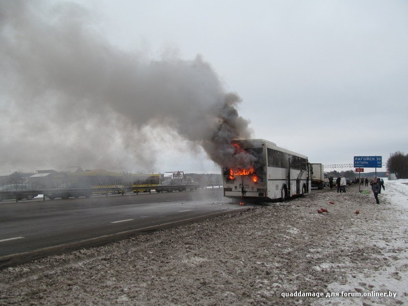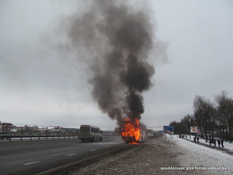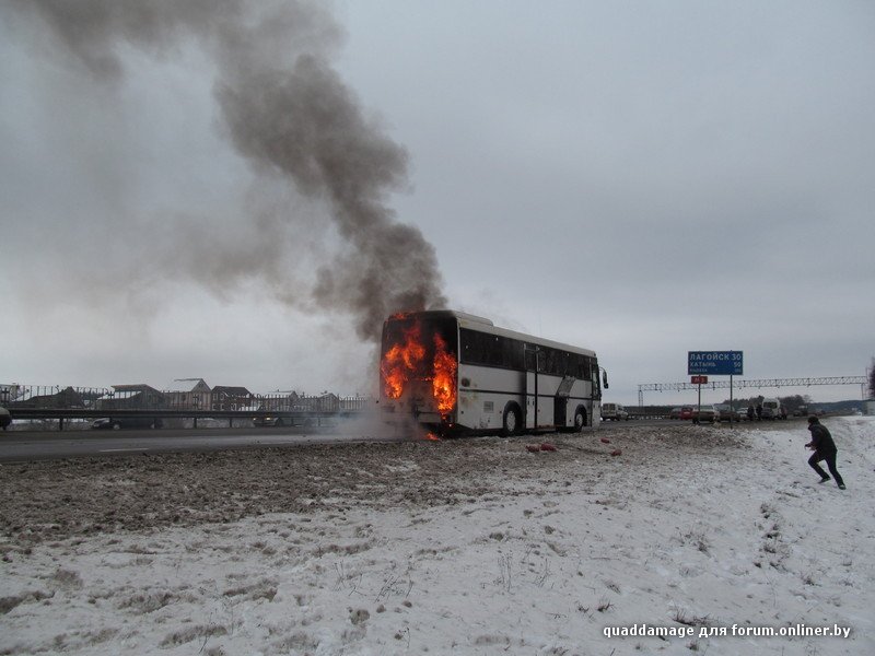 В Белоруссии на трассе М3 в тридцати километрах от Лагойска открытым огнем сгорел пассажирский рейсовый автобус. Люди, по счастью, не пострадали. Вот что пишут очевидцы происшествия: "Примерно вот так всё началось и закончилось. Да, все люди целы, успели выйти и вынести вещи (люди же первые огонь и заметили)."