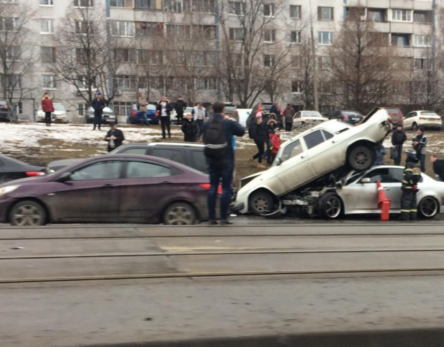 В Москве в районе Строгино произошло странное происшествие с участием автомобилей ВАЗ и BMW - "Жигули" оказались на крыше иномарки в результате какого-то загадочного маневра.