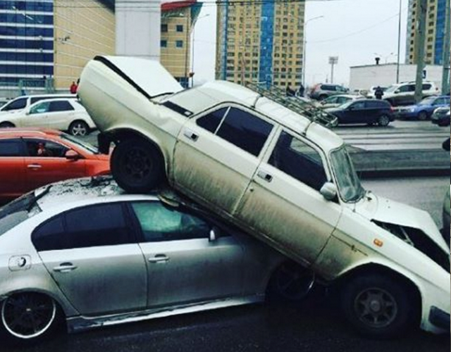 В Москве "Жигули" оказались на крыше BMW так, что водитель иномарки не смог выбраться