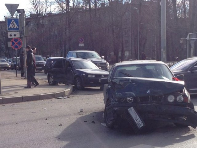 Возле дома № 26 по Светлановскому проспекту произошло столкновение автомобилей BMW и Volkswagen. Машины получили серьезные повреждения.