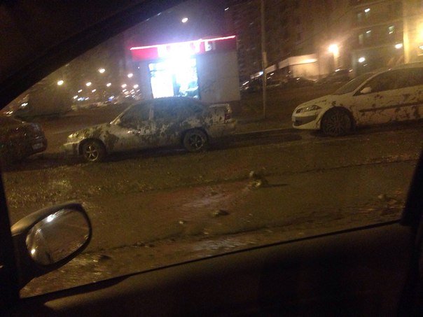 Инцидент произошел в ночь на 22 марта на Туристской улице в Санкт-Петербурге. Дорога и припаркованные автомобили оказались залиты цементом.