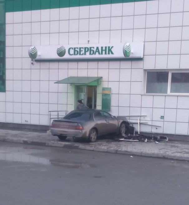 По сообщению очевидцев, сегодня рано утром в двухэтажное здание врезался автомобиль Toyota с двумя молодыми людьми в нем, протаранив вход в отделение «Сбербанка».