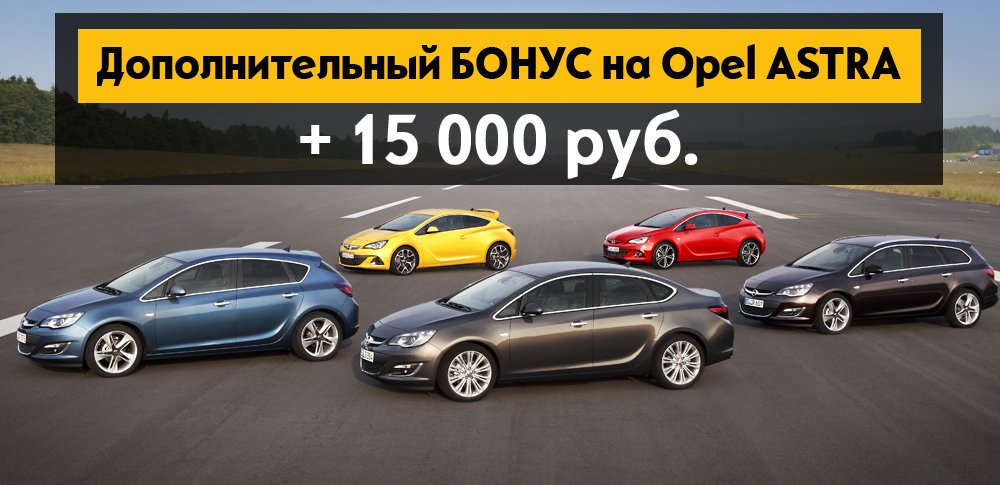 Официальный дилер General Motors дарит новые преимущества всем покупателям Opel Astra – автомобиля, который вот уже четверть века остается самым ярким представителем бренда. Первая версия автомобиля была выпущена в 1991 году, а в 2016-ом модель удостоилась престижной награды «Автомобиль года» в Европе. В рамках новой акции при приобретении Opel Astra, «АВТОРУСЬ» предоставляет бонус в 15 000 рублей, который суммируется с другими действующими преимуществами. В автосалоне представлены автомобили в различных комплектациях, с автоматической и механической трансмиссиями. Вы можете выбрать функциональный Astra J wagon, динамичный пятидверный хэтчбек или стильный седан – выгода гарантирована в любом случае!