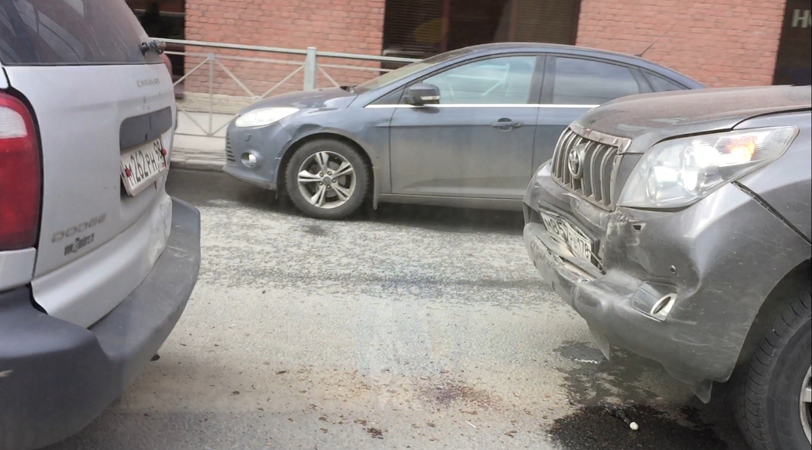 Очередная неприятная и досадная авария случилась днем в понедельник на Большом Сампсоньевском проспекте - столкнулись Toyota Land Cruiser и минивэн Chrysler Voyager. Внедорожник обозначен наклейкой "Неопытный водитель", что , возможно, и стало отчасти причиной произошедшего.