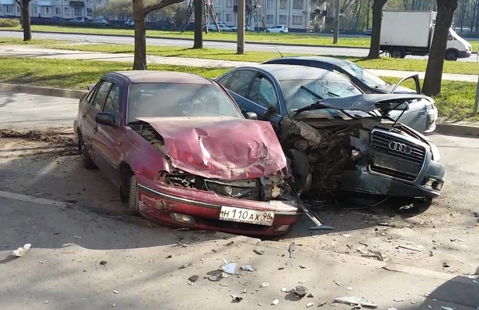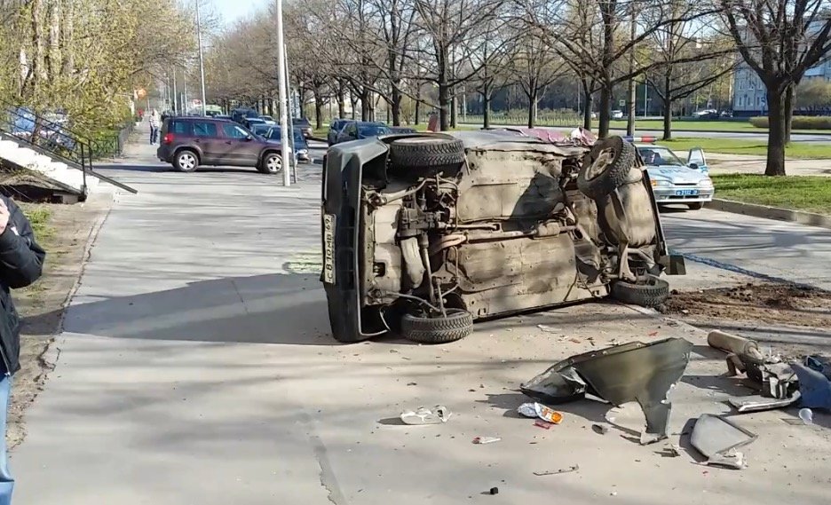 В боковом проезде проспекта Космонавтов произошло крупное ДТП с опрокидыванием одного из автомобилей - водитель легкового автомобиля ВАЗ не справился с управлением на большой скорости совершил наезд сразу на пять припаркованных здесь авто.
