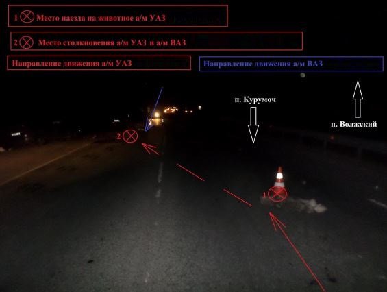 По предварительной информации, 57-летний водитель автомобиля УАЗ-21514, двигаясь из Курумоча в поселок Волжский, сбил выскочившую на проезжую часть собаку. Водитель съехал на полосу встречного движения, где врезался в ВАЗ-21140под управлением 55-летнего мужчины.
