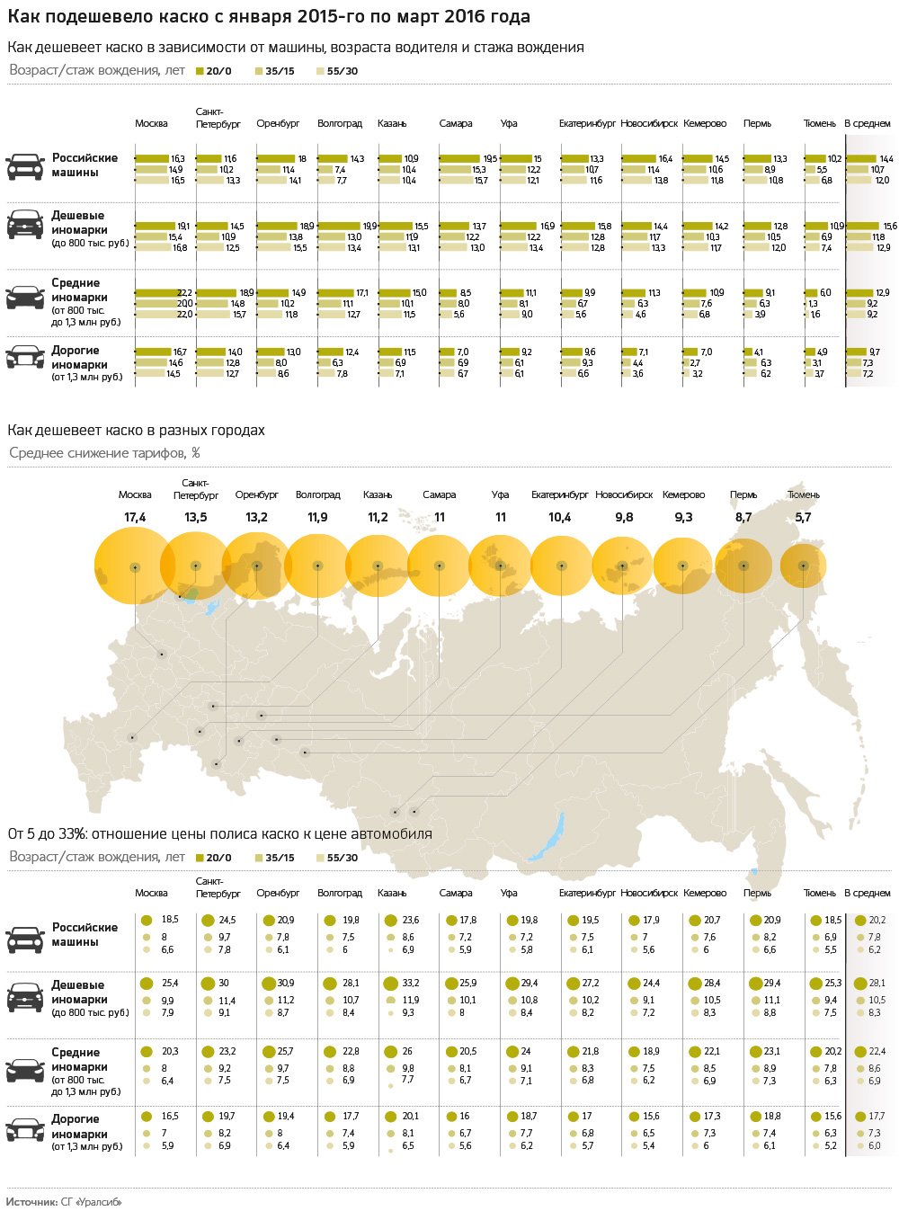 Специалисты страховой группы «Уралсиб» провели исследование, показывающее изменение тарифов КАСКО на популярные отечественные и иностранные автомобили для водителей трех групп: 20-летние водители без стажа, 35-летние со стажем 15 лет, 55-летние с опытом вождения 30 лет. Были взяты данные восьми крупнейших по объему сборов КАСКО страховых компаний в 12 крупных городах России. Рассматривался период с января 2015 года по март 2016 года.