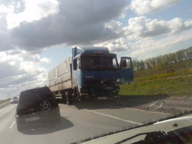По сообщениям очевидцев, легковой автомобиль Volvo выехал на полосу встречного движения и врезался в большегруз (тоже Volvo). Некоторые свидетели выдвигают версию, что у фуры оторвалось колесо, и это она выехала на встречку.