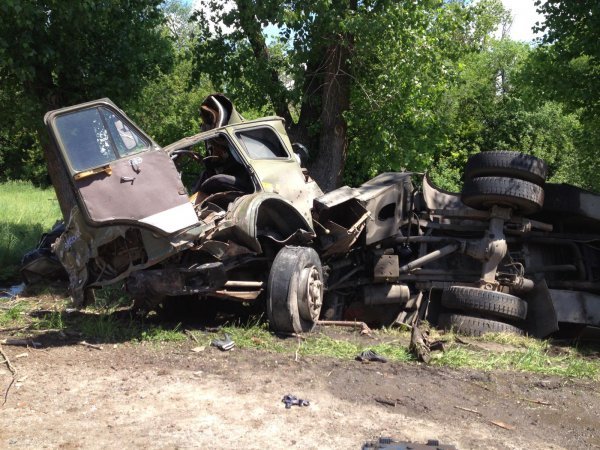 После столкновения грузовой автомобиль перевернулся, произошла незначительная утечка дизельного топлива. Выехавшие на место сотрудники МЧС не допустили его возгорания.