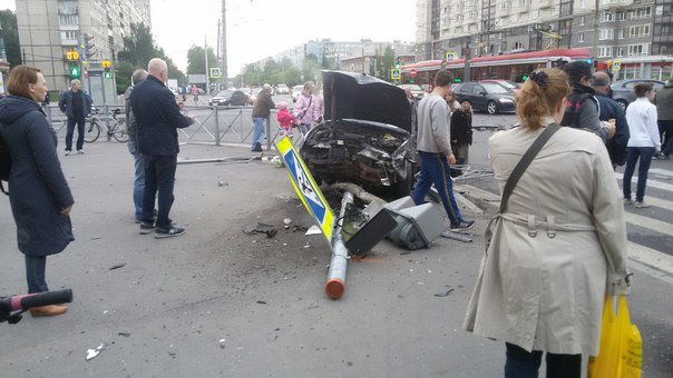 Авария произошла вечером 21 мая, в 19:30 на пересечении проспекта Солидарности и улицы Подвойского. Легковой автомобиль вылетел на тротуар и сбил светофор.