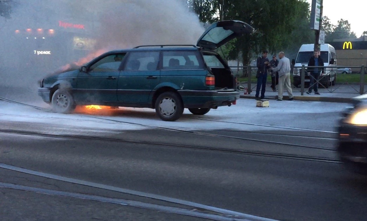 Старенький Volkswagen Pаssat универсал сгорел открытым огнем на проспекте Энгельса у перекрестка с Скобелевским проспектом напротив торгового комплекса. В автомобиле полностью выгорел моторный отсек.