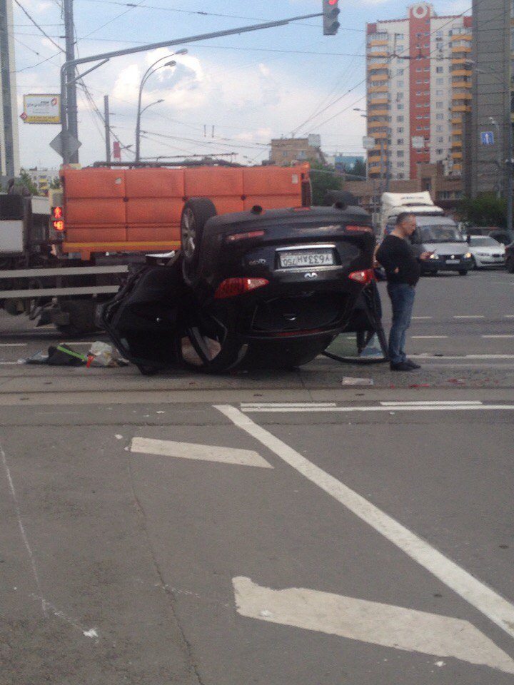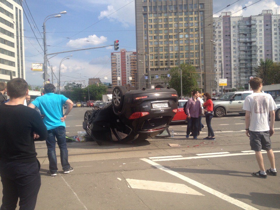 Авария произошла 27 мая в 15:30 в центре Москвы на площади Крестьянская застава. После столкновения двух автомобилей, один из них – Infiniti – перевернулся на крышу.