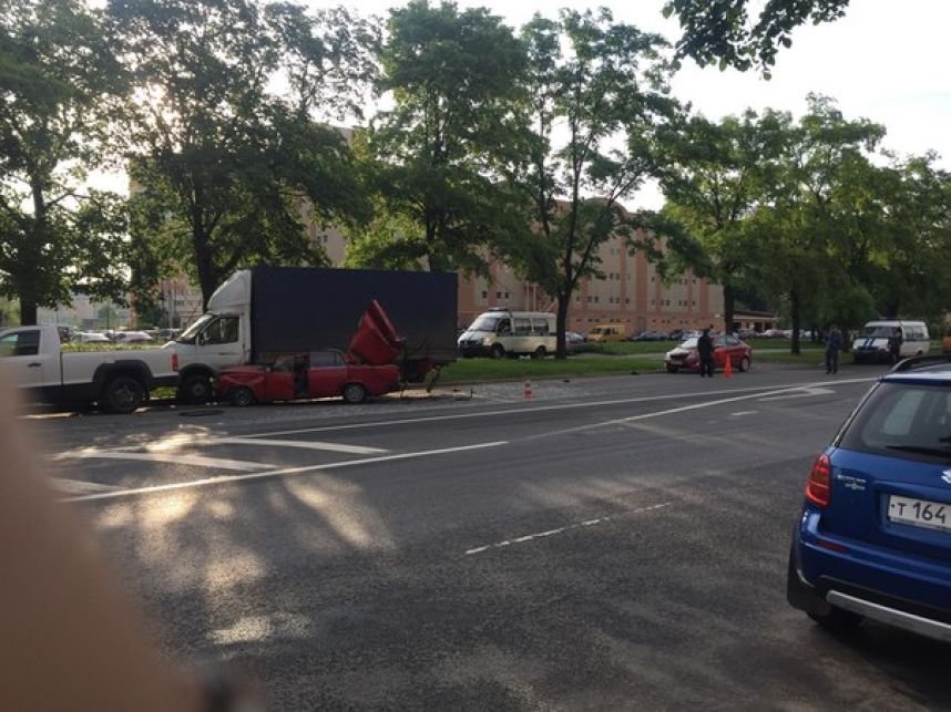 На Дачном проспекте у дома №7/1 водитель автомобиля ВАЗ не справился с управлением, зацепил автомобиль KIA и влетел под припаркованную «Газель», а та, в свою очередь, в стоящий впереди Volkswagen Amarok. В результате столкновения у легковушки оторвало крышу.
