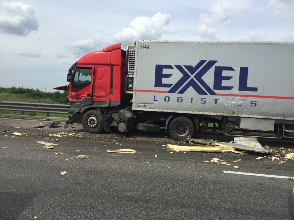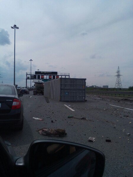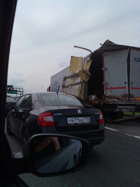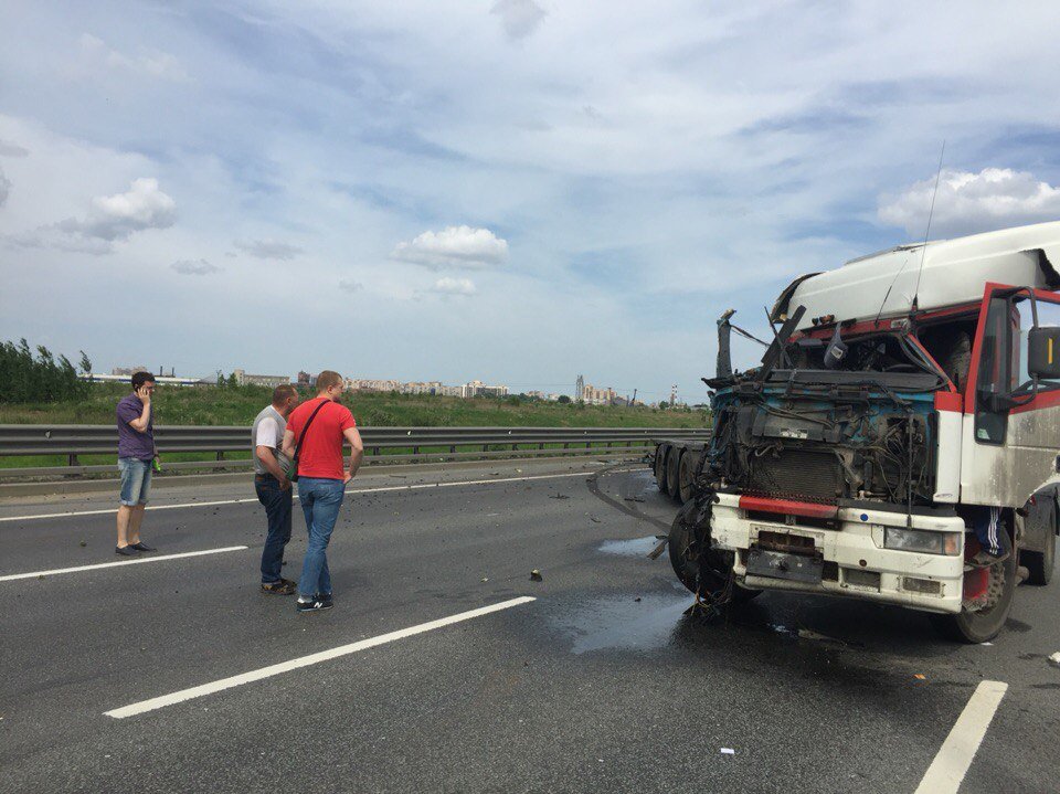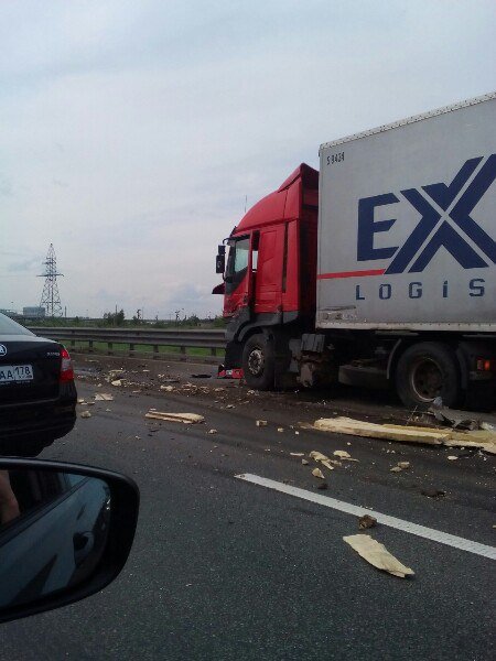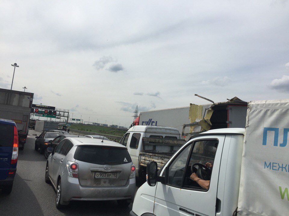 Авария произошла днем в понедельник, 30 мая, на внутреннем кольце на подъезде к развязке с Пулковским шоссе. На дороге столкнулись два грузовика – один из них перевернулся.