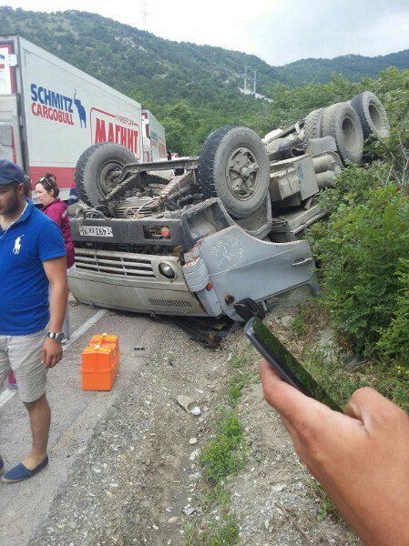 По предварительной информации, 58-летний водитель КАМАЗа, двигаясь в сторону Геленджика, превысил скорость, потерял управление и столкнулся сначала с автомобилем Nissan Murano, а затем с Lada Priora. После этого грузовик опрокинулся.