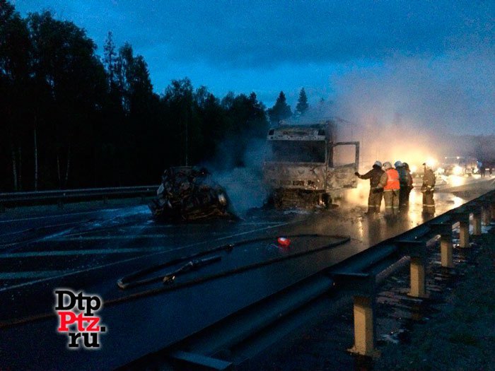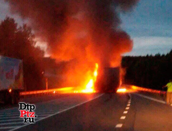 По предварительным данным, на дороге столкнулись встречные фура и легковой автомобиль. В результате столкновения загорелся сначала легковой автомобиль, а позже пламя перекинулось и на грузовик.