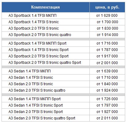 Кроме того, автолюбители могут приобрести автомобиль в комплектации Sport, включающей спортивные передние сидения, спортивную подвеску, отделку салона алюминием и систему Audi drive select. Стоимость такого пакета составит 87 000 рублей.