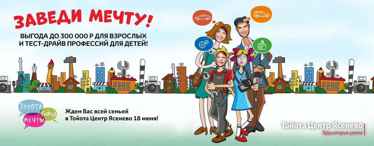 Для маленьких гостей – тест-драйв увлекательных профессий! В «Городе мечты Toyota» дети в возрасте от 3 до 12 лет смогут, получив трудовую книжку и униформу, в увлекательной и захватывающей форме под присмотром профессиональных инструкторов-аниматоров попробовать себя в одной из трех профессий из мира автомобилей: автомеханика, автожурналиста или автодизайнера.