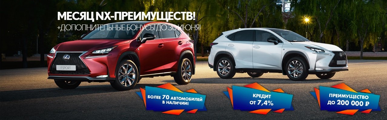 * С 1 по 30 июня 2016 года при условии сдачи а/м с пробегом по программе Lexus Trade‑In (Трейд-Ин) при покупке а/м Lexus NX 2015–2016 года выпуска в любой из существующих комплектаций предоставляется выгода до 200 000 руб. (выгода достигается посредством предоставления скидки от МЦП а/м). Количество а/м ограниченно. Подробности на www.lexus-yasenevo.com и по тел. 8 495 7777712.