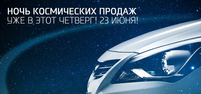В быстром ритме мегаполиса найдите время для себя! Ночь – время, когда не надо спешить, когда на дорогах нет пробок, а наш дилерский центр держит двери открытыми специально для вас до 00.00. А ночь космических продаж – время для лучшей цены!