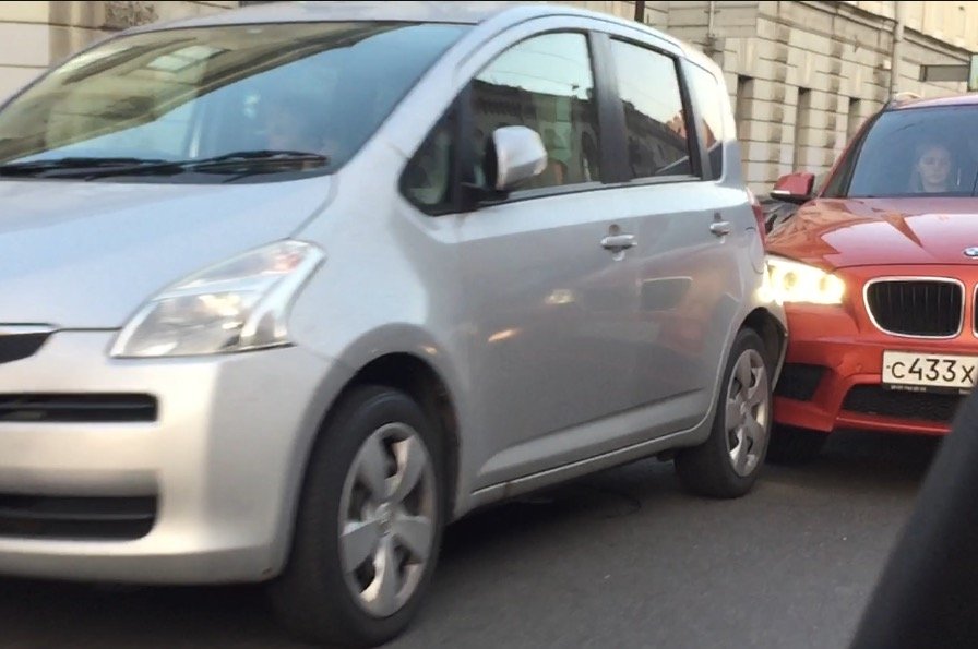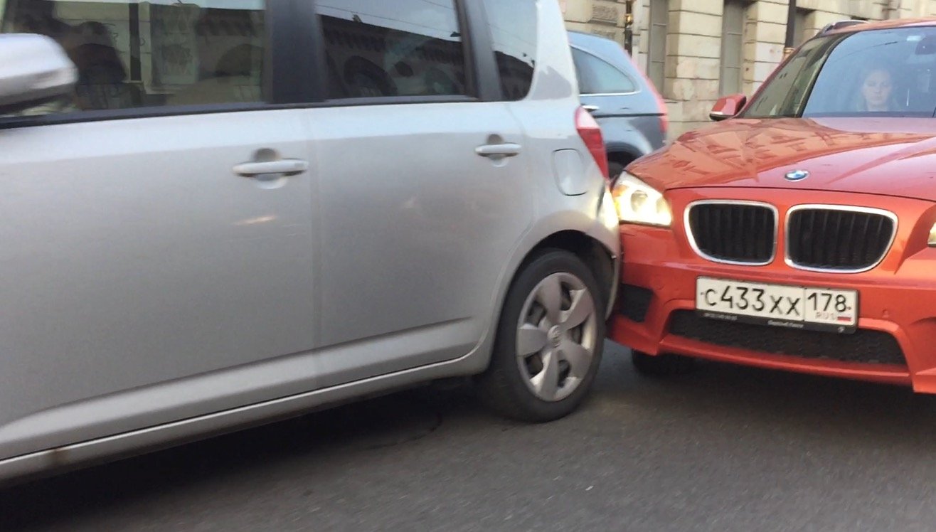 ДТП на Литейном проспекте - похоже что за рулем обоих автомобилей-участников столкновения милые дамы. Одна из них, управляя минивэном Toyota с правым рулем, не заметила ехавшего позади нее слева кроссовера BMWx1 и нечаянно подрезала его с результатом - столкновением транспортных средств.