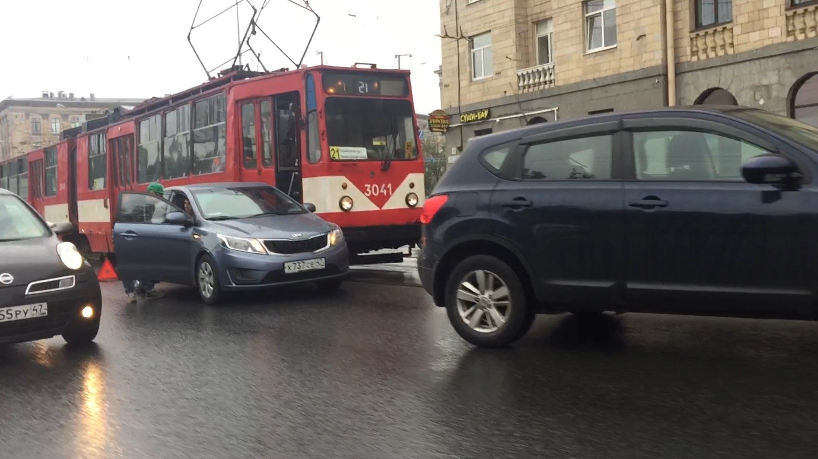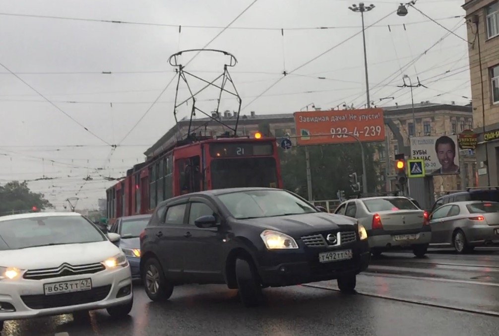 Неудачное маневрирование на проспекте Энгельса/Светлановская площадь привели к ДТП с участием трамвая, хэтчбэка Kia Ceed, и кроссовера Ниссан Кашкай. Судя по всему, водитель "Ниссана" решил совершить манёвр левого поворота – (разворота?) что оказалось неожиданностью для ехавшего следом за ним автомобиля "Киа", который от испуга принял влево и навалился на ехавший здесь в параллельном направлении трамвай.