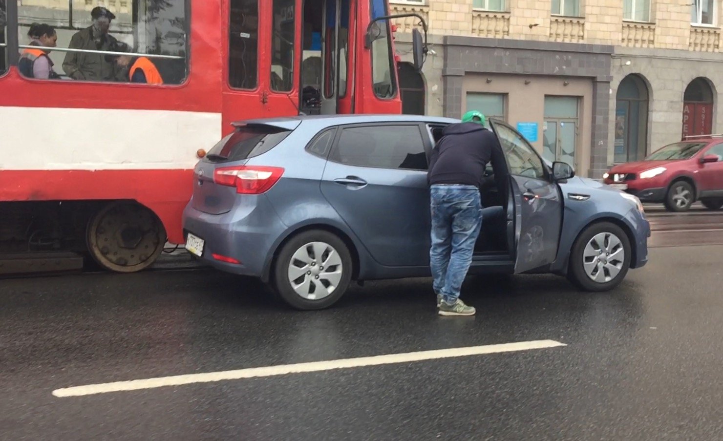 KIA CEED навалился левым бортом на трамвай на Светлановской площади.