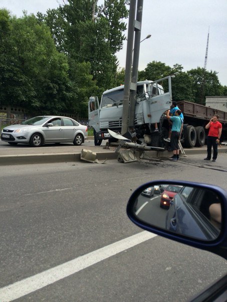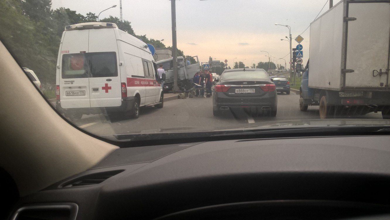 ДТП на Митрофаньевском шоссе в Петербурге произошло сегодня, 1 июля, днем. При спуске с моста по направлению движения в сторону Обводного канала грузовой автомобиль «Камаз» врезался в столб.
