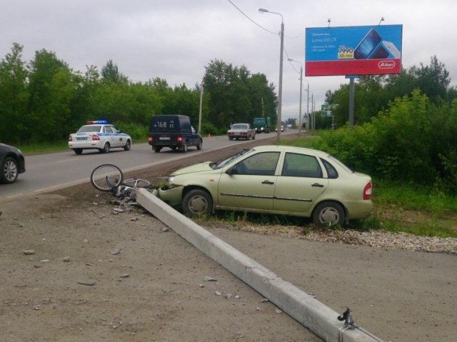 В Перми сегодня, 1 июля, в 7:15 на ул. Встречная водитель «Лады-Калины» не смог увернуться от велосипедистки и от столба.